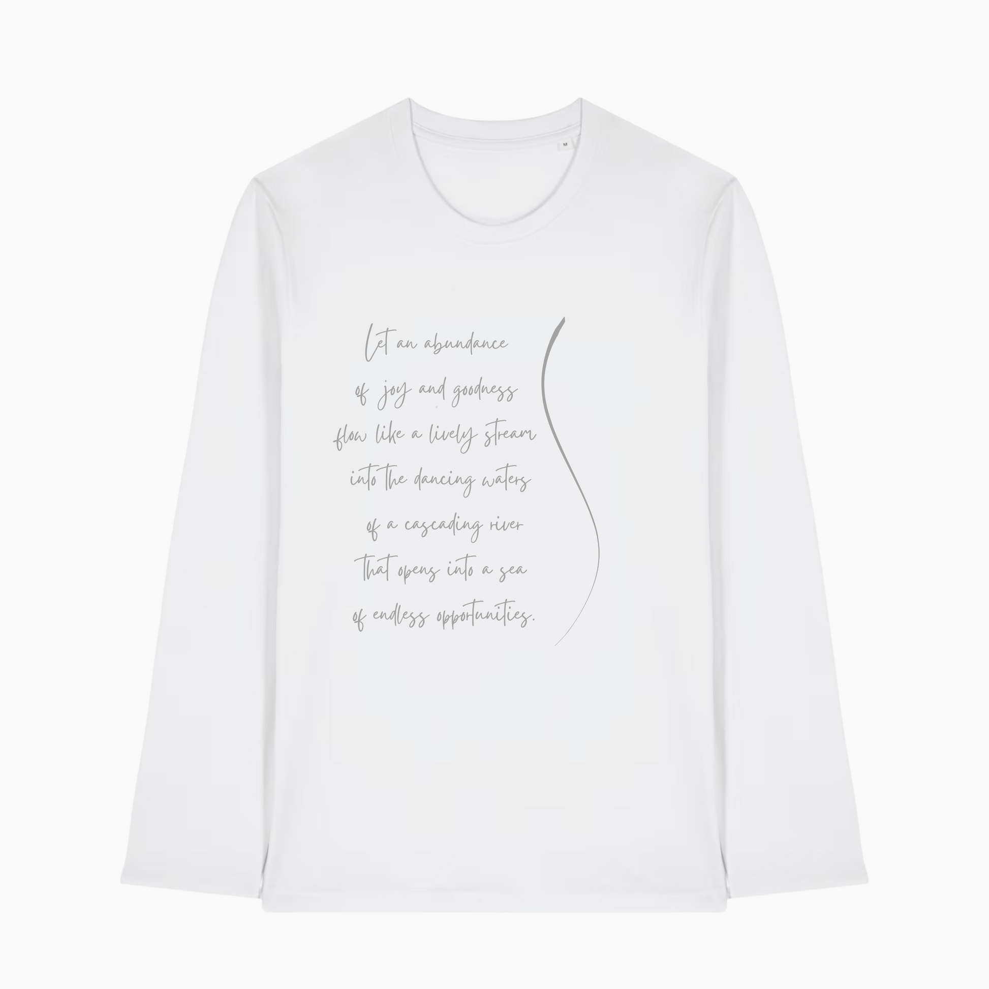 Flow into possibility with this organic long sleeve tee. Featuring the uplifting verse “let an abundance of joy and goodness flow…into a sea of endless opportunities,” it’s a wearable reminder to welcome joy, gratitude, and new beginnings every day.