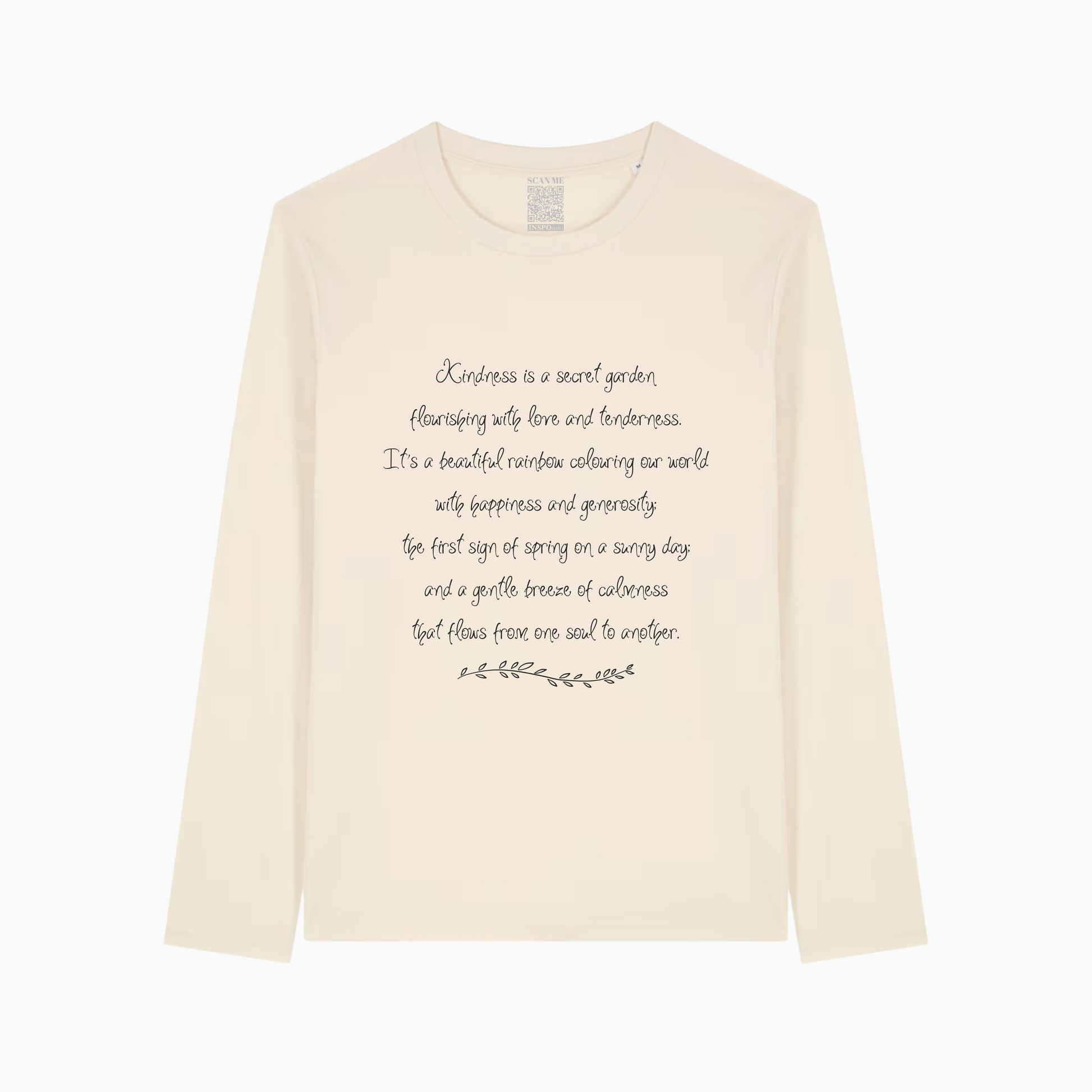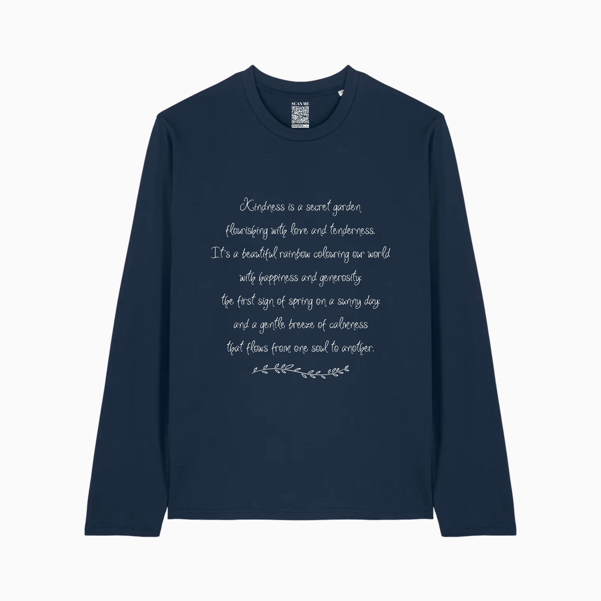 Your tee has a scannable QR Code that links to our INSPOinfo YouTube affirmations channel. We want you to not only be inspired by the message on your t-shirt, but to also have immediate support by accessing powerful affirmations that help you stay on track and maintain the positive mindset that relates to the theme of the item of clothing you have kindly bought.