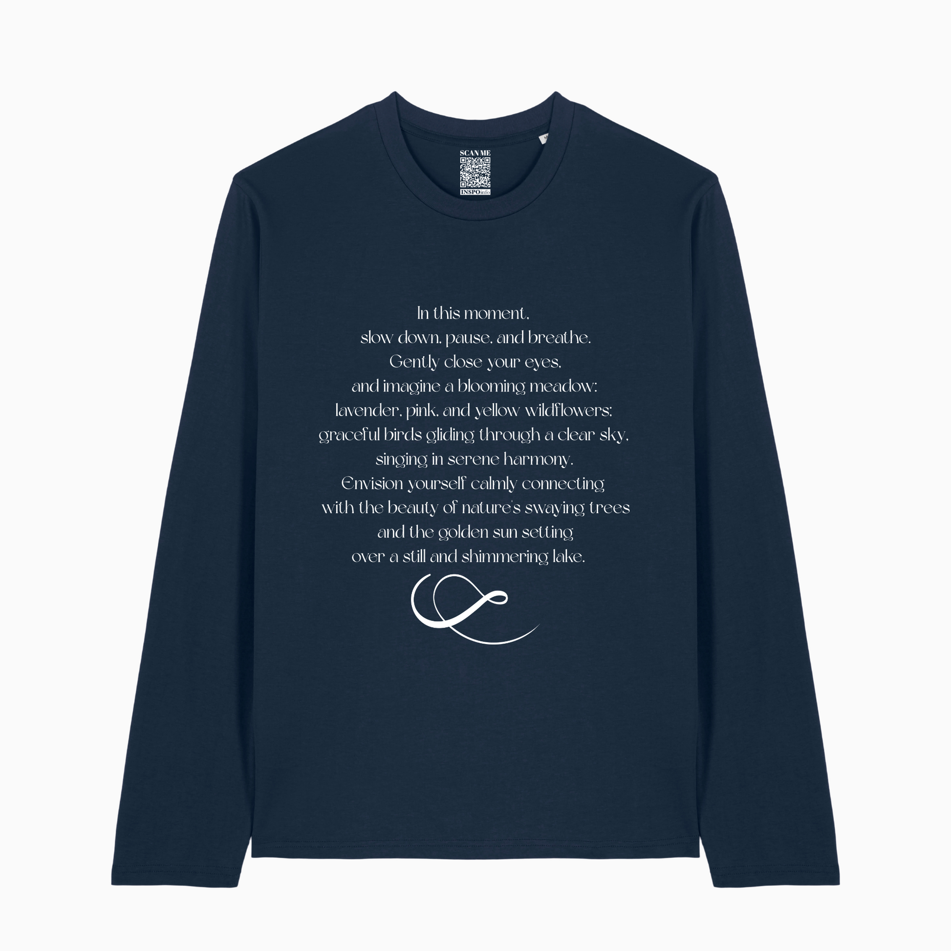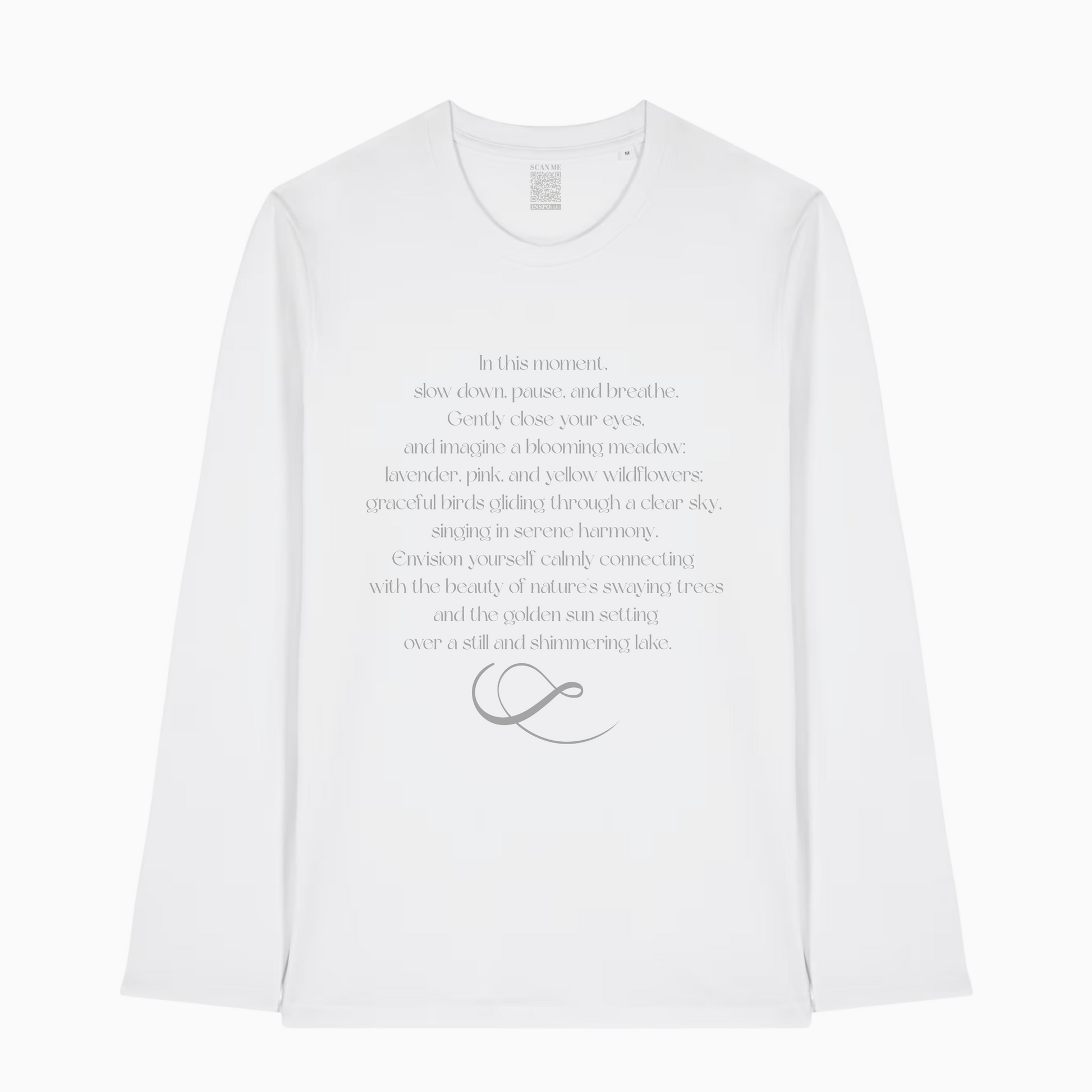 This long sleeve organic T-shirt is a gentle reminder to return to stillness and carries the soothing words:
