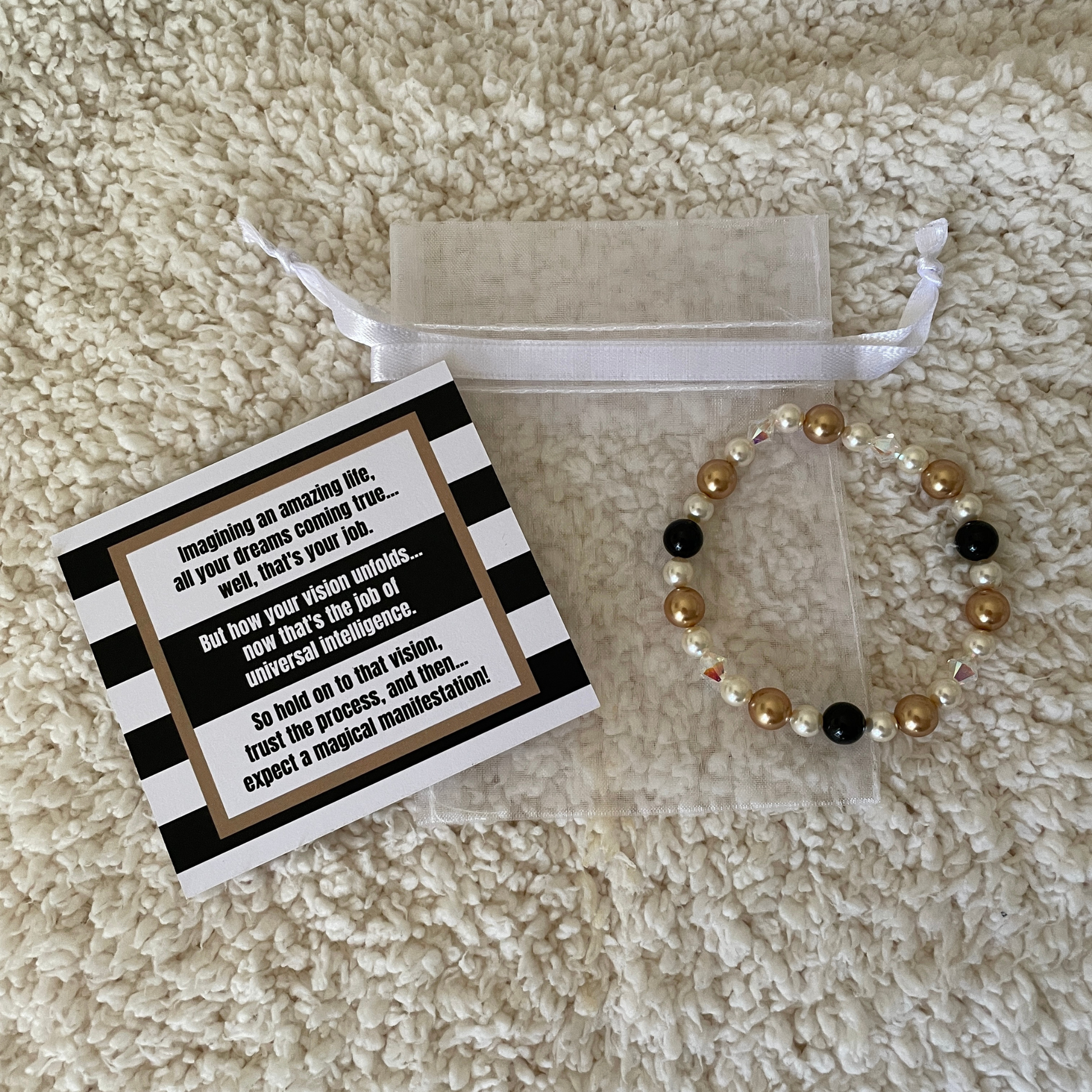 Handmade in Western Australia, this Swarovski Crystal bracelet blends gold pearls for confidence and warmth, black tourmaline beads for grounding and emotional protection, white pearls for clarity and calm, and clear crystals for lightness and inner balance.