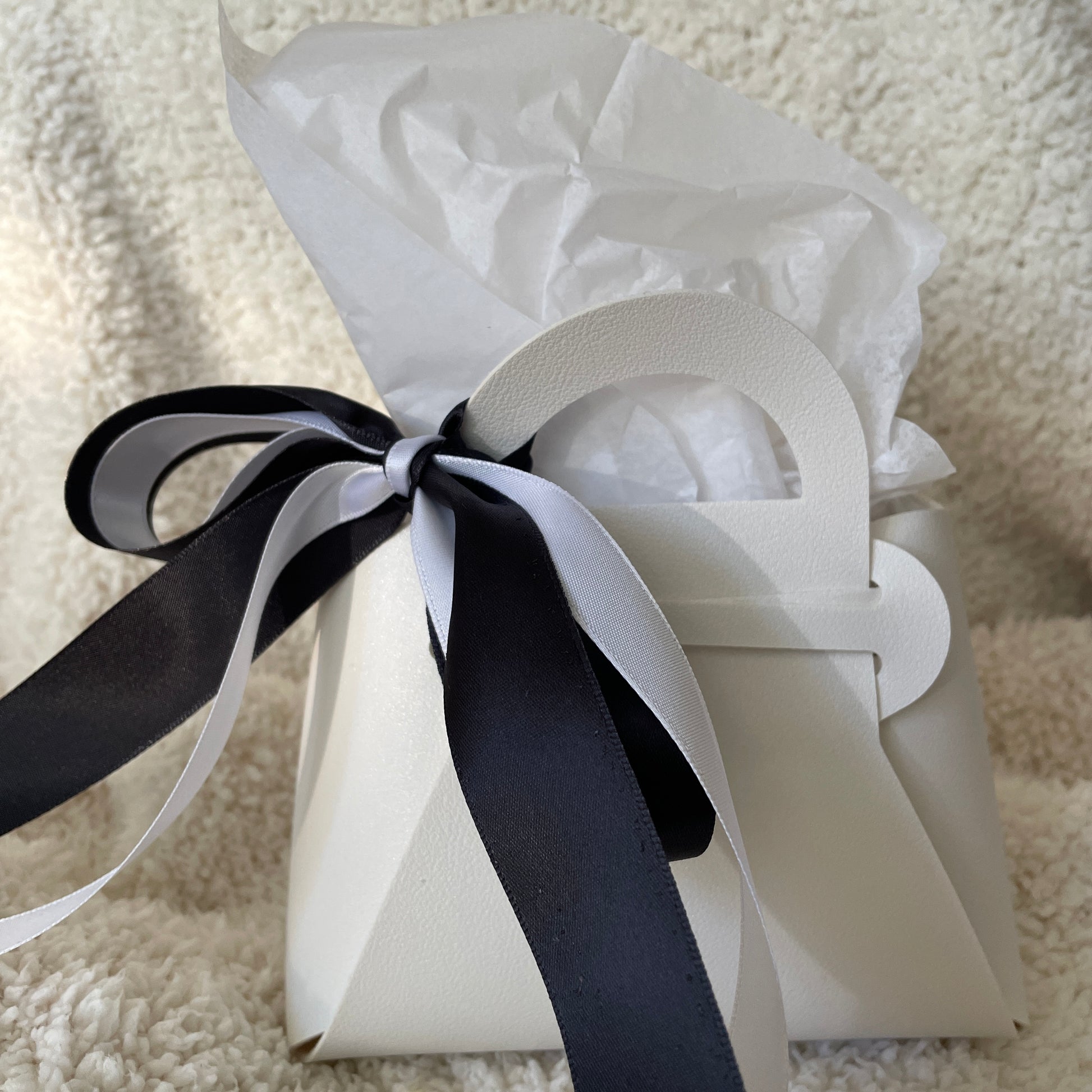 • White mini vinyl 'handbag' (gift bag) with black and white and ribbon tied to the handle